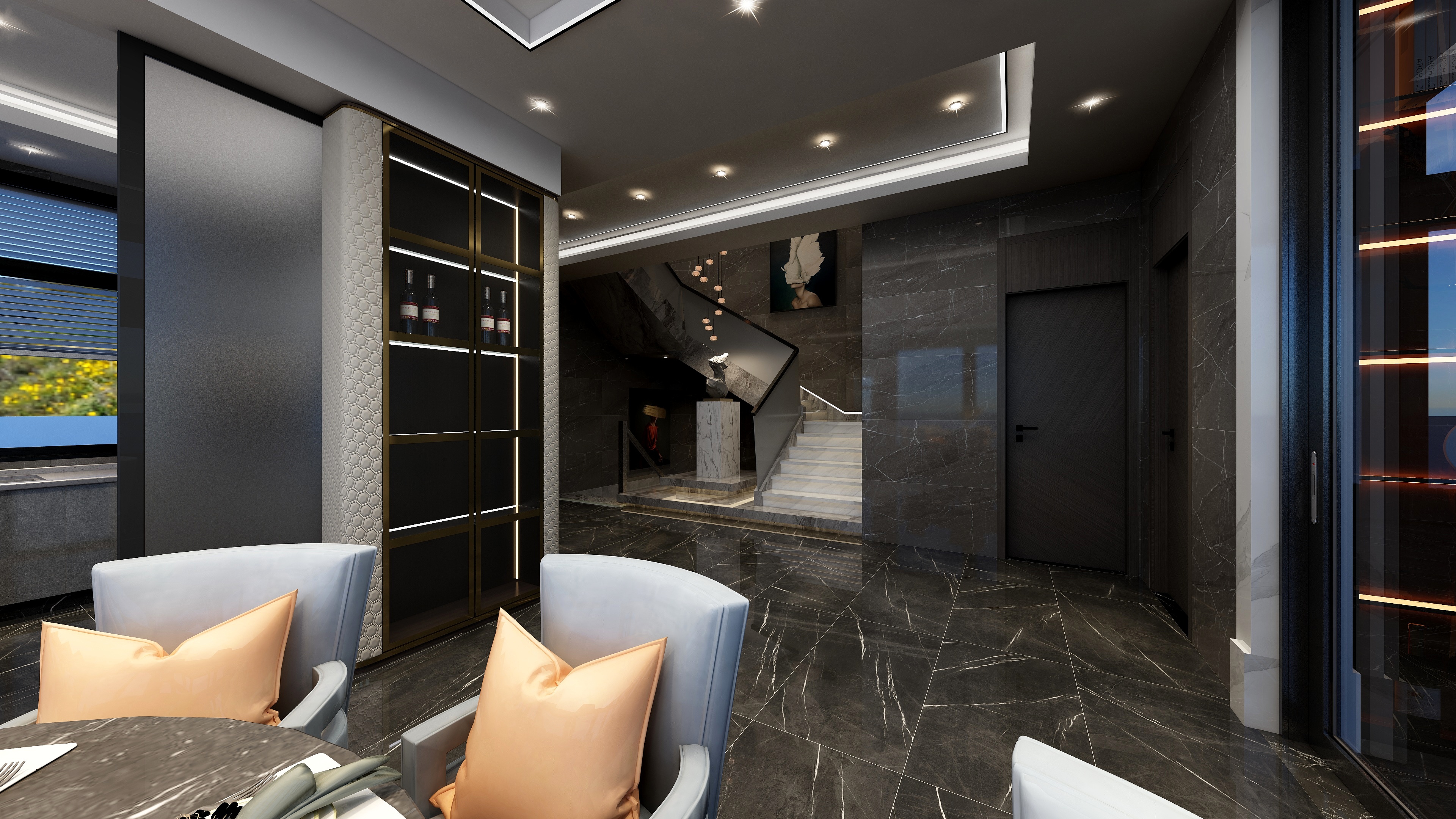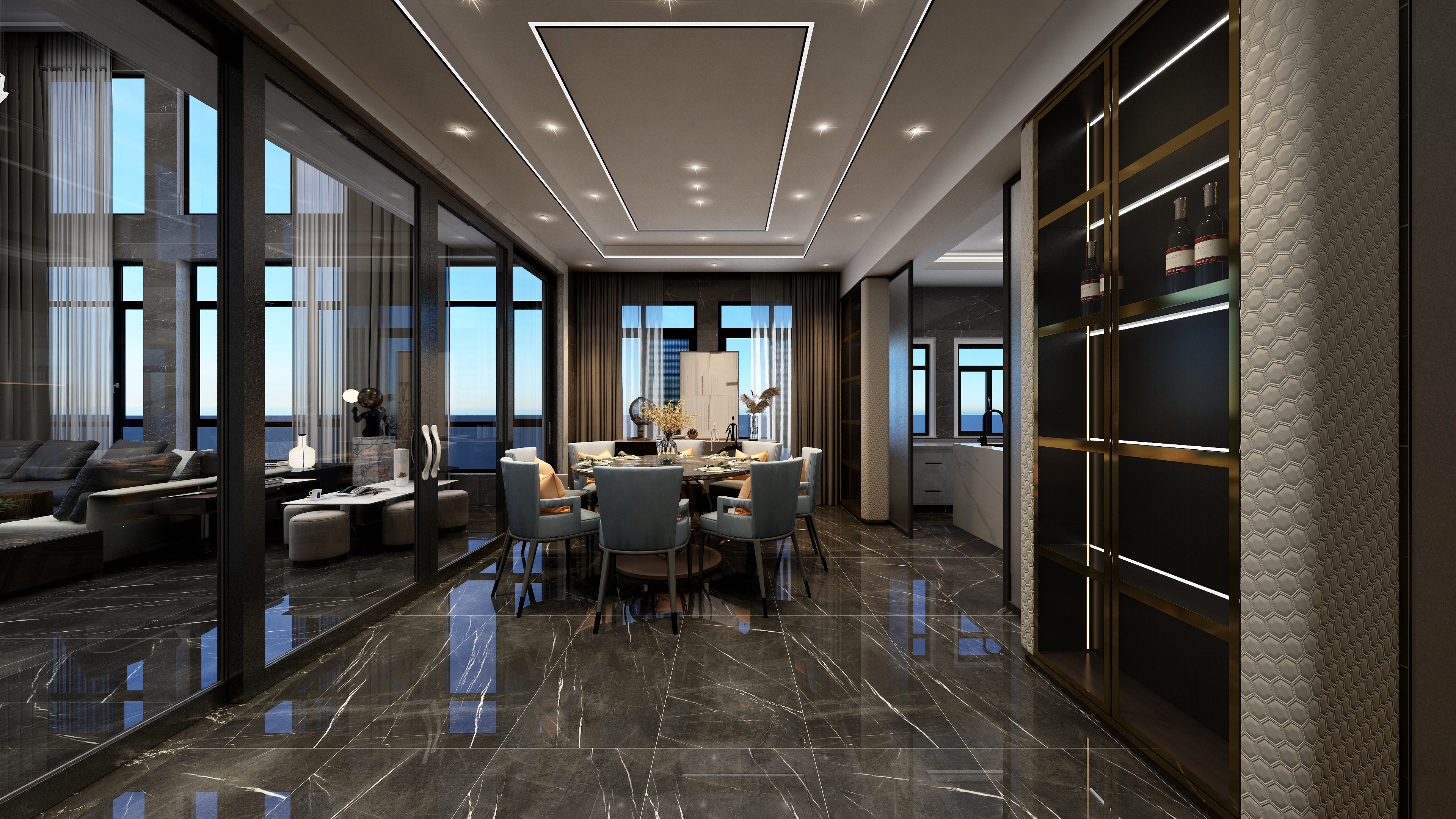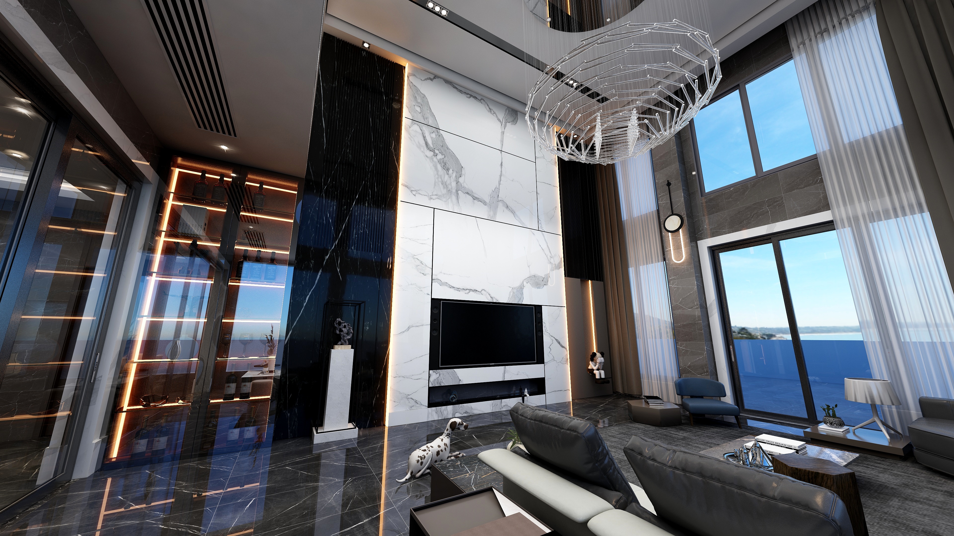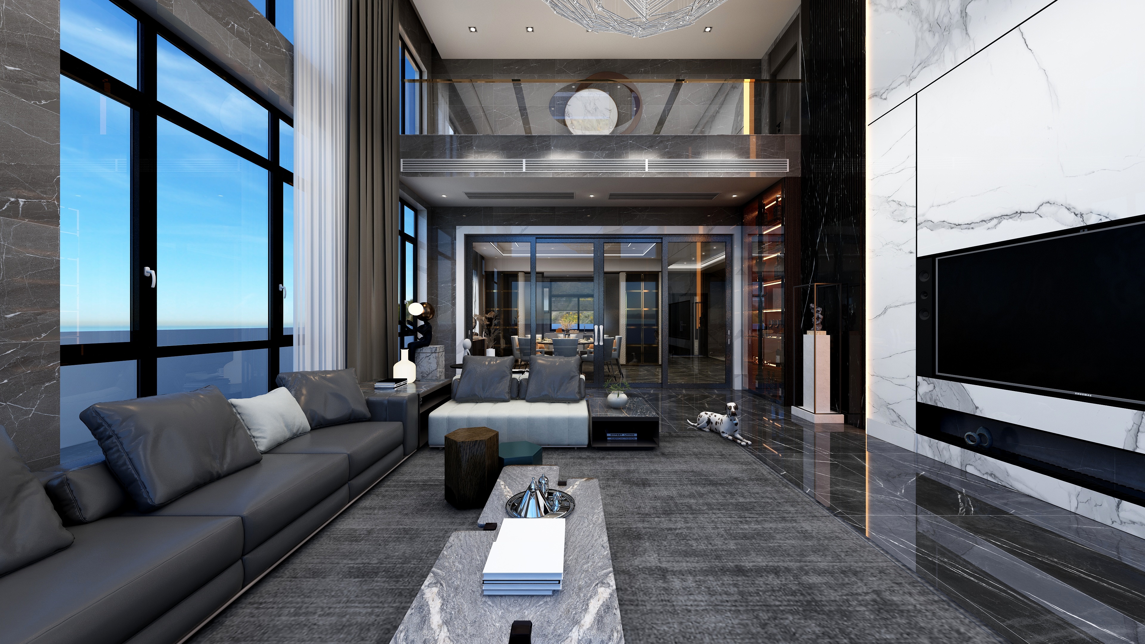 本案極具現代高級都市感,材質上大面積使用高檔石材和NAPPA真皮,背景墻由木飾面和天然石材鋪貼而成。整體顏色以深色灰調和大理石為主,再以爵士白石材突出現代感。